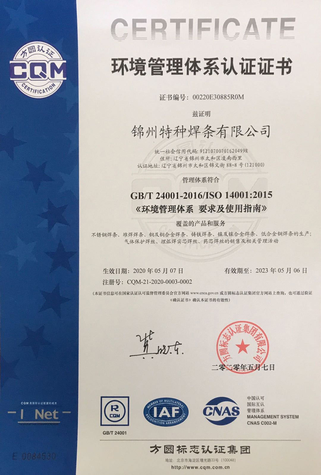 認(rèn)證類別:GB/T 24001-2016/ISO 14001:2015 《環(huán)境管理體系 要求及使用指南》